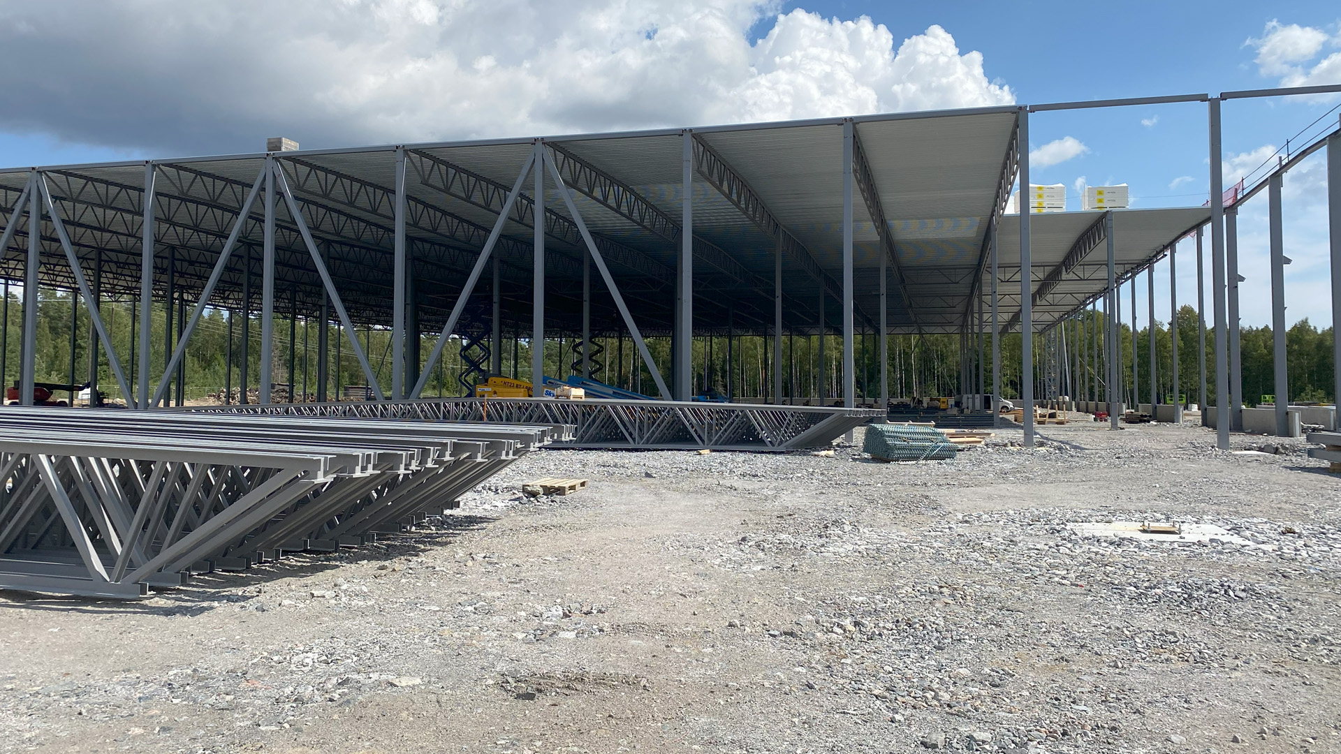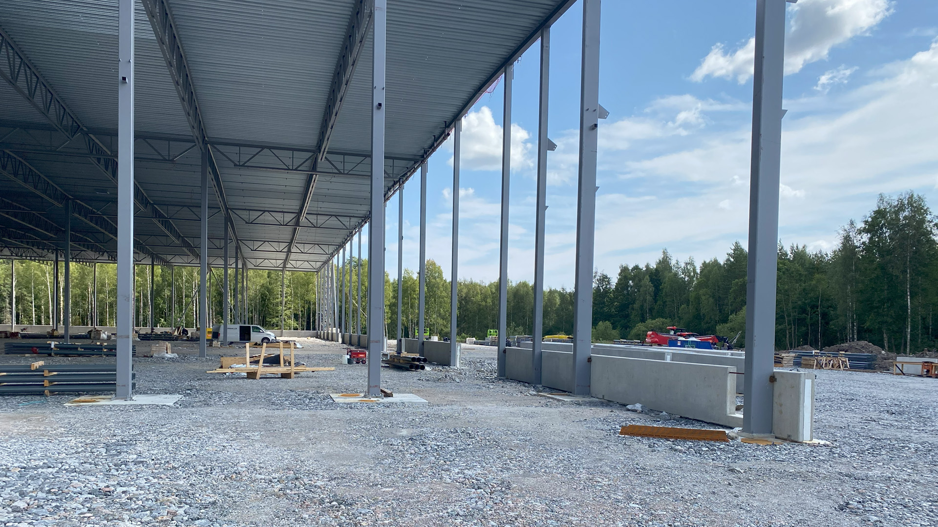 Bilderna visar hur snabbt man rest logistikhallen på Finnslätten. De två översta bilderna är från i somras och sista bilden här ovan är från november i år. I dag är fastigheten helt täckt med väggar och tak.