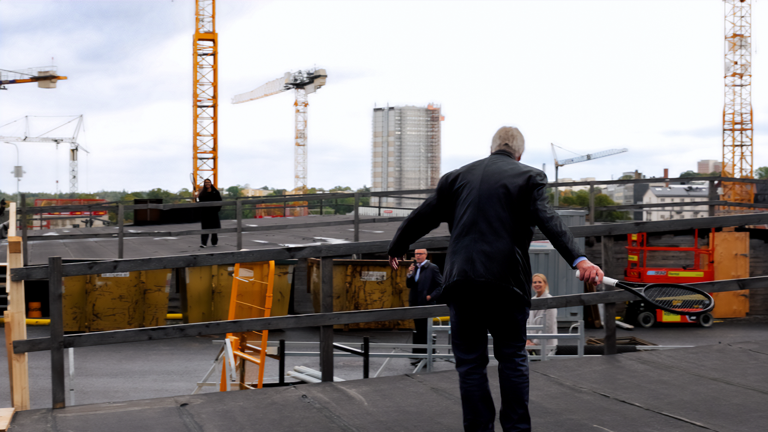 Det symboliska tennisslaget är en blinkning till Infinitys koncept men också till hur projektet ligger precis vid gränsen mellan Stockholm och Solna.