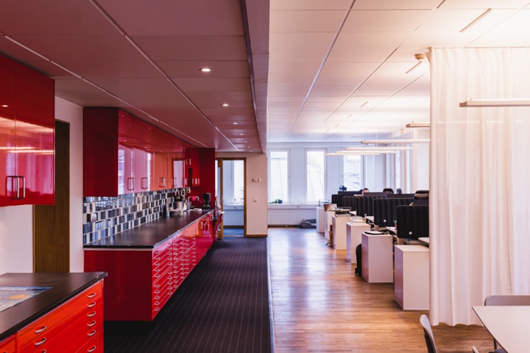 "Vi tror det var några arkitekter som satt här innan och de har verkligen skapat något speciellt. Det är som ett gigantiskt kök och stora öppna ytor för arbetsplatser."