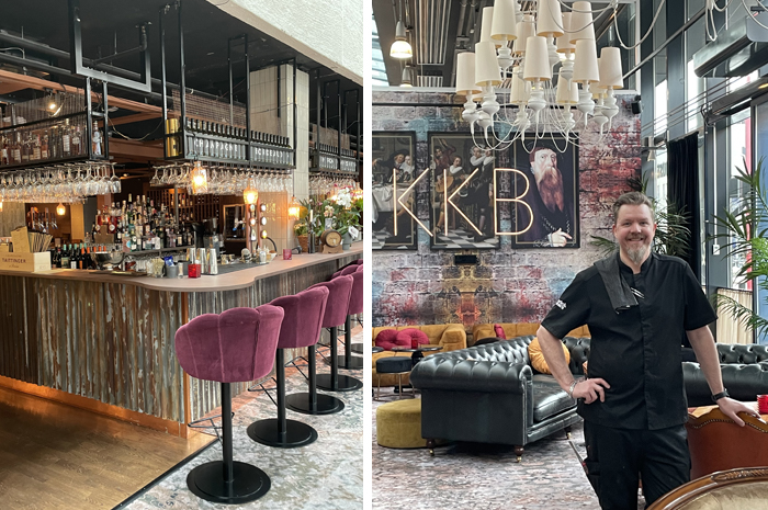 Till vänster ser vi baren på nyöppnade Kött Kök & Bar och till höger står delägare Anders Törnkvist i loungen på KKB.