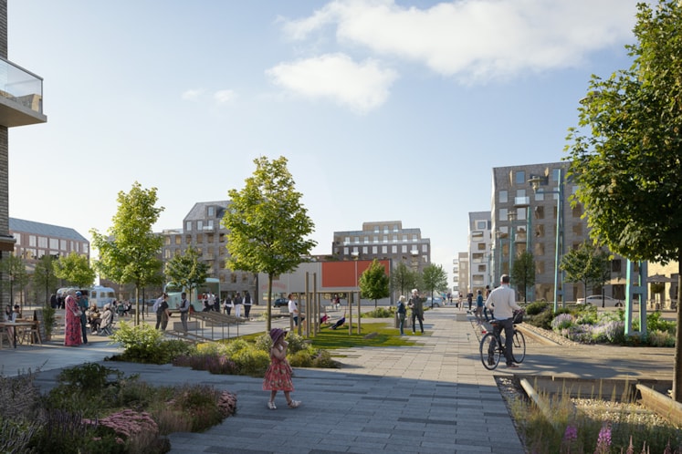 Här skapas nya blomsterplanteringar kantat med cortenstål ihop med nyplanterade träd för att öka den biologiska mångfalden och skapa skugga för Castellums fastigheter så de inte behöver kylas ner lika mycket på sommaren.