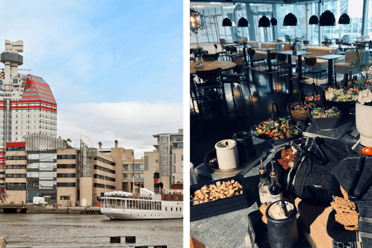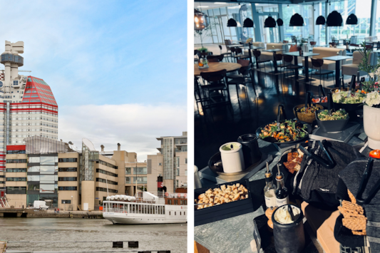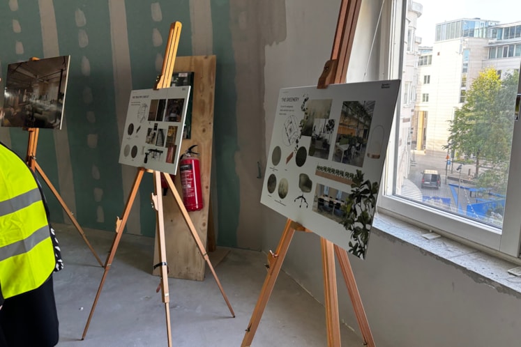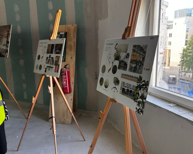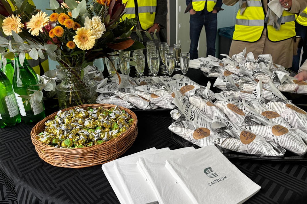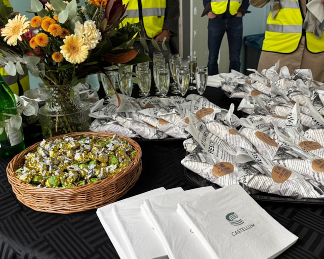 I slutet av september bjöds medarbetare in till en visning på byggarbetsplatsen. Där presenterades visionsbilder, materialval och exempel på återbrukade byggdelar. Rundvandringen förgylldes av bubbel och lättare lunch tillsammans med representanter från Castellum, arkitektbyrån Semrén & Månsson samt entreprenören BRA Bygg.