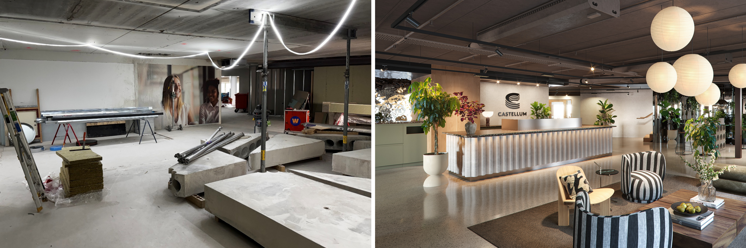 Bild på kontoret som det ser ut idag under konstruktion och visionen på receptionen från samma vinkel.