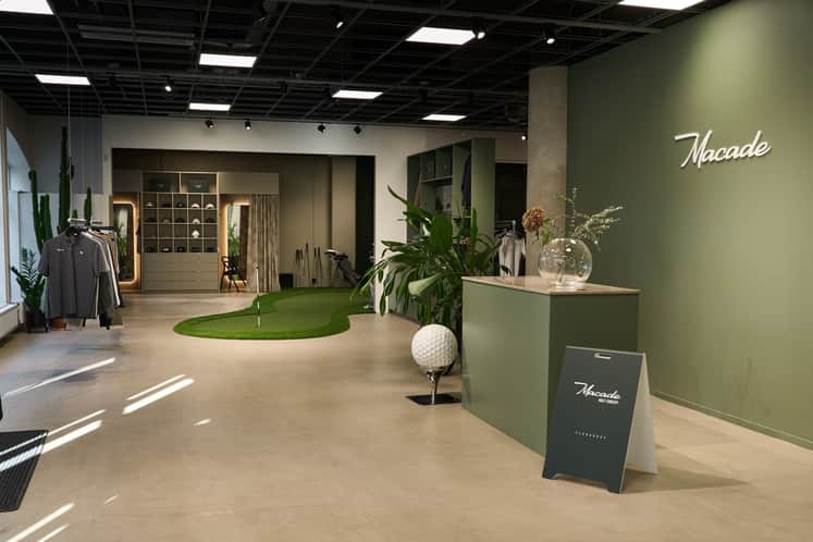 Lokalen är anpassad till Macades behov och långt ifrån en traditionell butiksyta. Här finns en fullskalig golfsimulator, en golfboll stor som en pumpa och en inredning som speglar varumärkets moderna, sportiga estetik. Det är en plats där besökare kan uppleva Macade på riktigt – prova kläder, testa svingen och hämta inspiration.