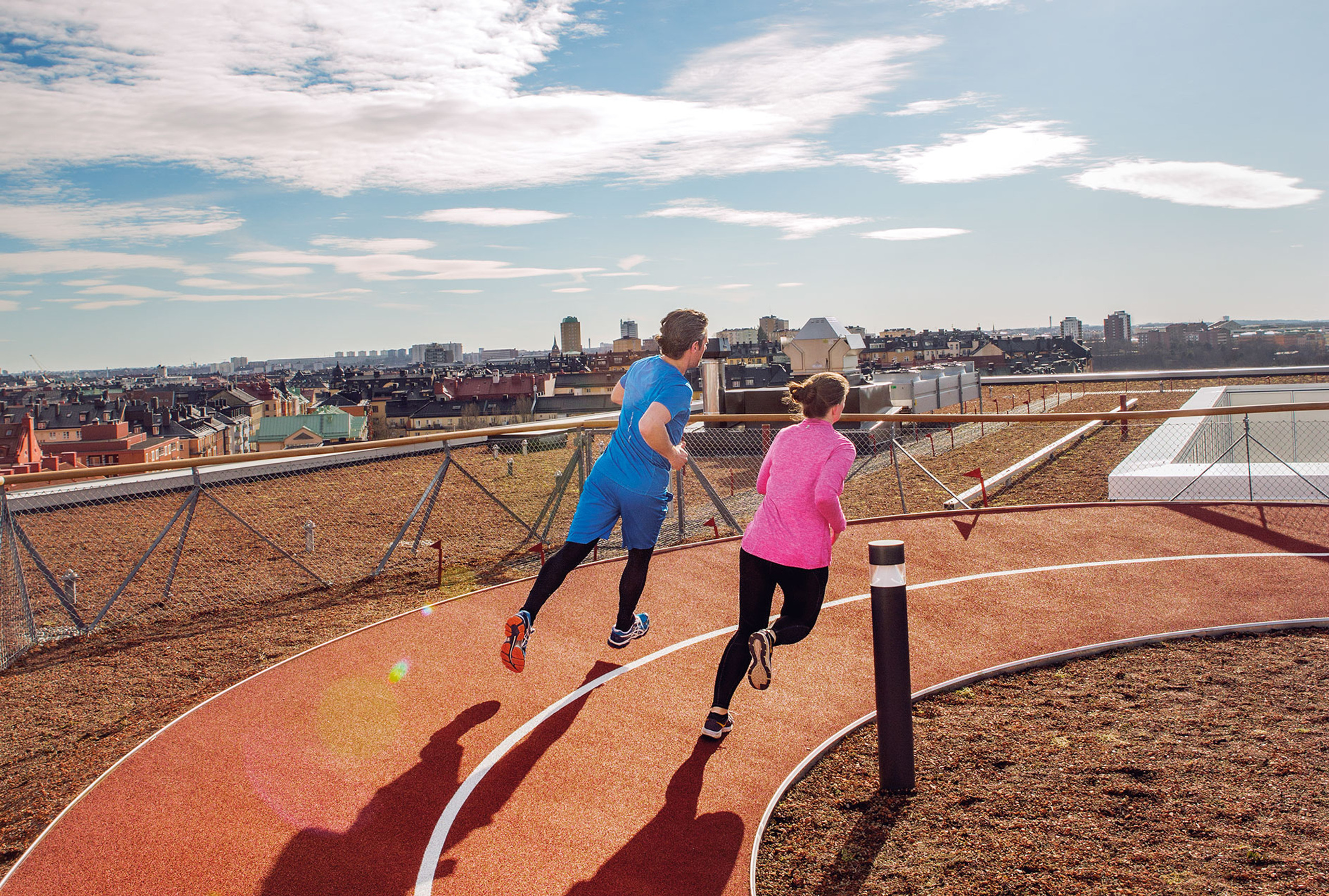 Fotografi från Castellums fastighet Isotopen i Hagastan, Stockholm. På fastighetens tak finns en löpbana och träningsredskap.