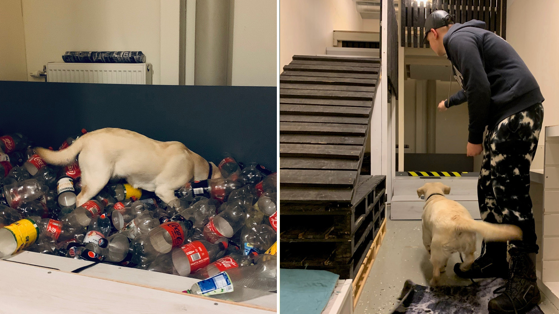 – Ett rum är uppbyggt som en matsal där hundarna får leta reda på saker vi har gömt. Vi har ett annat rum med en tågkupémiljö där hundarna kan träna sök och så har vi ett rum med ett slags bollhav av flaskor där hundarna får leta reda på saker. De älskar det!