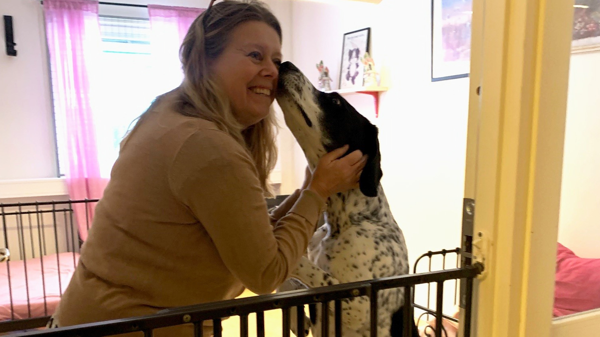 Susanne Ekstedt får en puss av dagishunden Maggan.