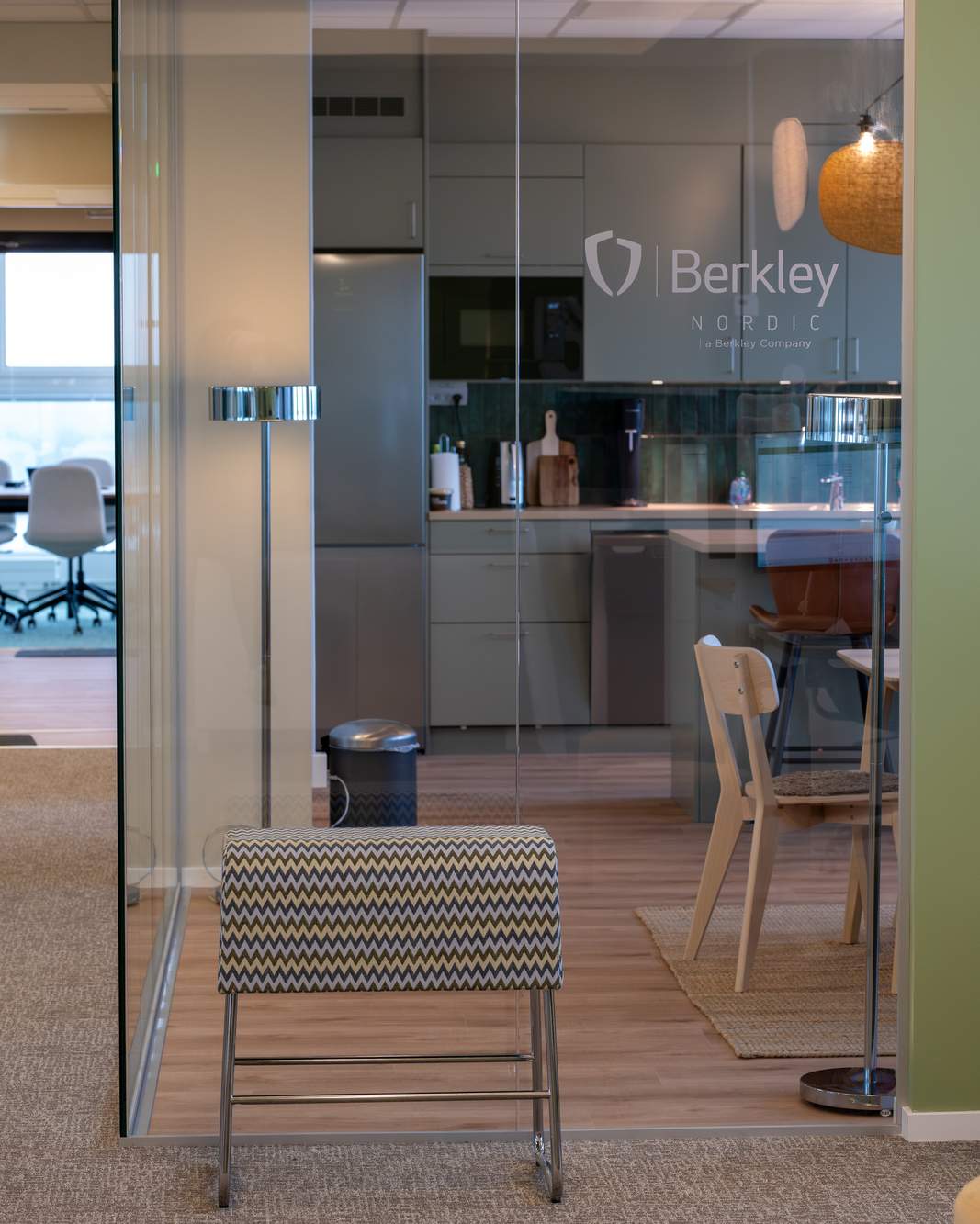 Man lät bygga upp väggar för att skapa konferens- och mötesrum. Köket, som går i harmoniskt gröna toner precis som resten av lokalerna, omges av hela glaspartier från golv till tak. I övrigt är det ett enda stort kontorslandskap med högt i tak.