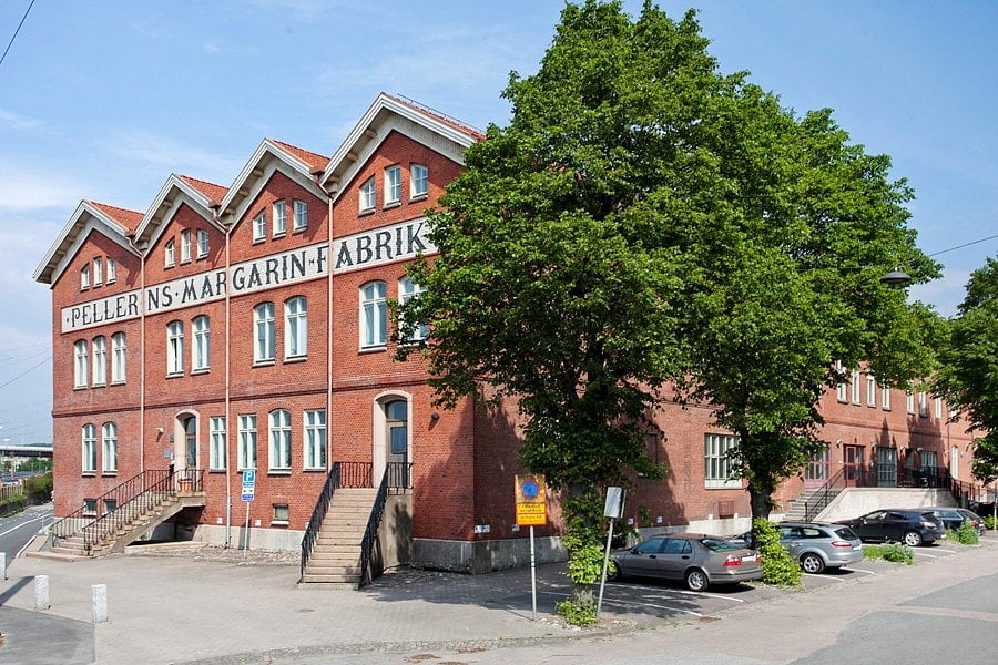 Det syns bra från både väg och järnväg, namnet som förevigats i den vackra tegelfasaden. Pellerins Margarinfabrik står med stora tidstypiska bokstäver och minner om en svunnen epok. Idag ägs de tidigare fabriksbyggnaderna i Olskroken av Castellum och är ett kreativt nav för många olika verksamheter, mitt i en av Göteborgs mest dynamiska stadsdelar.