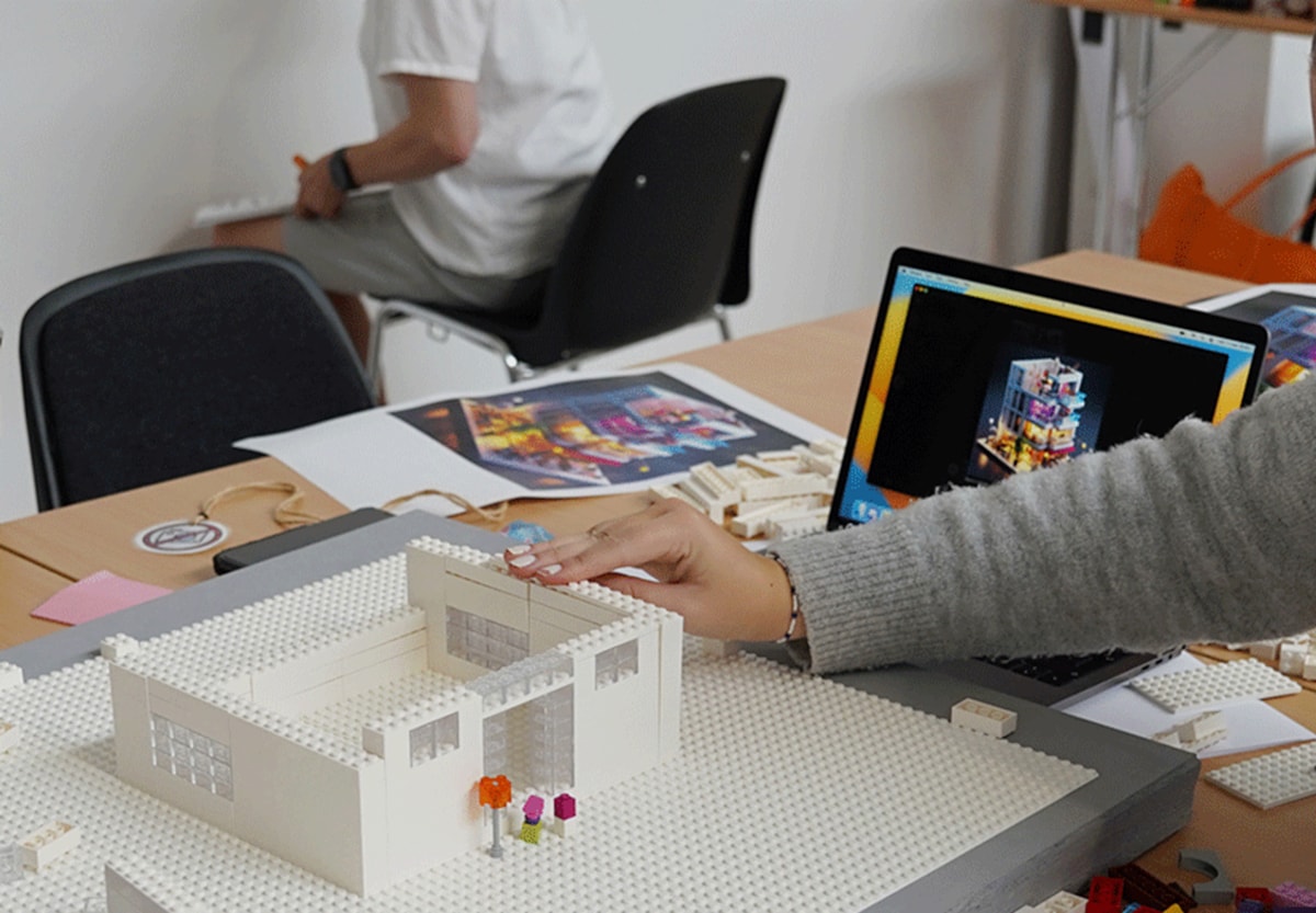 På plats fanns Magnus Göransson från Lego Masters för att guida och inspirera medan byggena växte fram. Nästa steg var att fotografera byggena och skriva ut bilderna på stora A1:or och därefter fortsatte arbetet med att skapa rätt känsla genom att klippa och klistra.