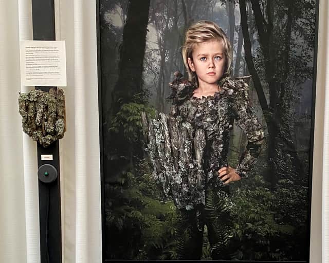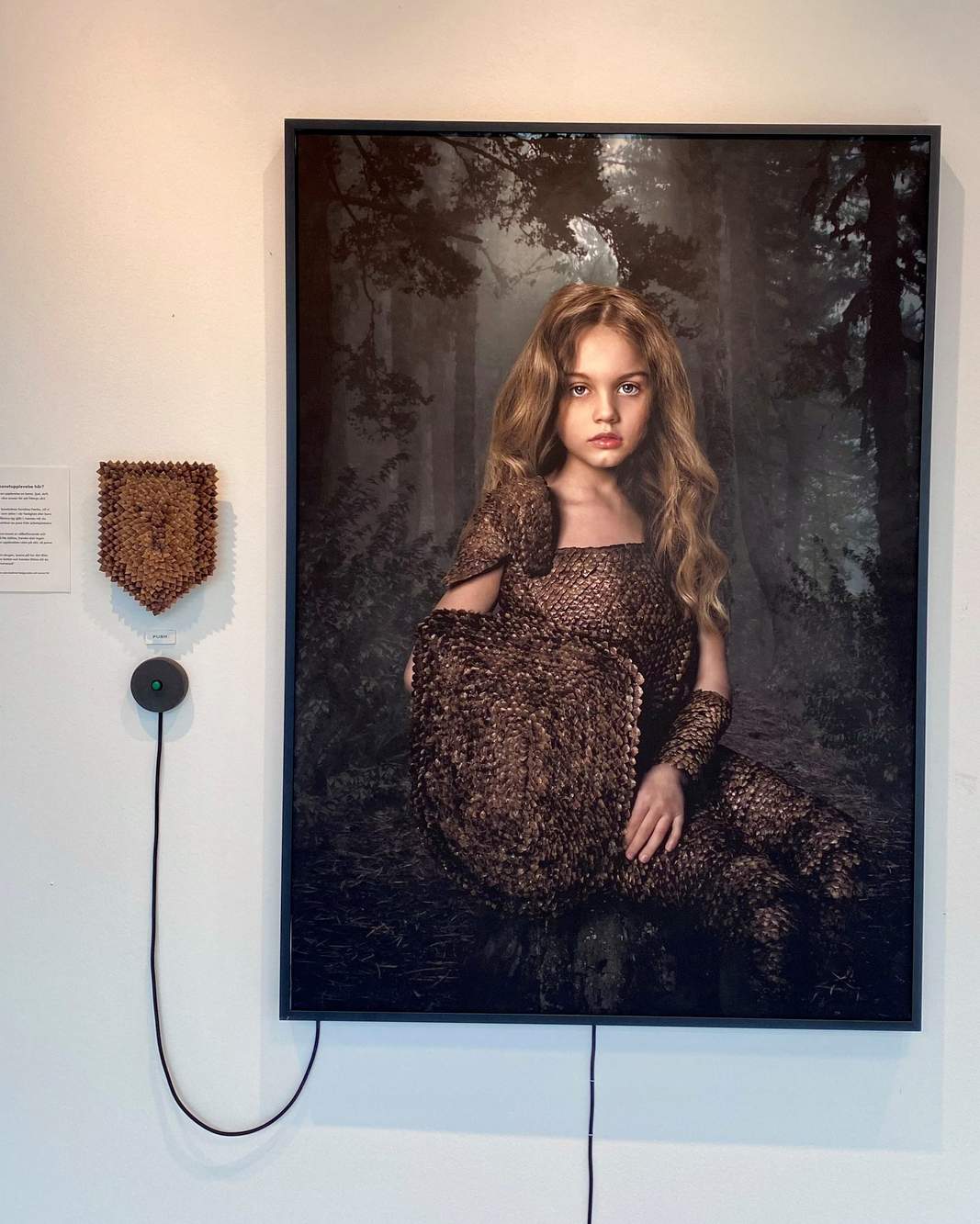 Vid sidan av fotografiet som föreställer ett barn i en drömsk skogsmiljö, hänger en liten kotte-tavla att känna på. Samtidigt flödar ljuden och doften av skog och natur så att du helt kan förflytta dig till sagoskogen, om så bara för en liten stund.