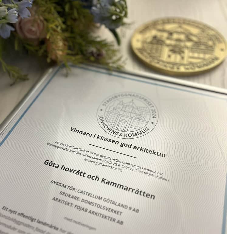 - Vi tackar Fojab, Jönköpings kommun samt Domstolsverket för ett gott samarbete som ledde fram till att denna ståndsmässiga byggnad kunde uppföras. Även om fastigheten inte längre tillhör Castellums bestånd är vi oerhört stolta över att för andra året i rad vinna Jönköpings Stadsbyggnadspris, säger Andreas Georgii, affärsområdeschef Castellum Jönköping.