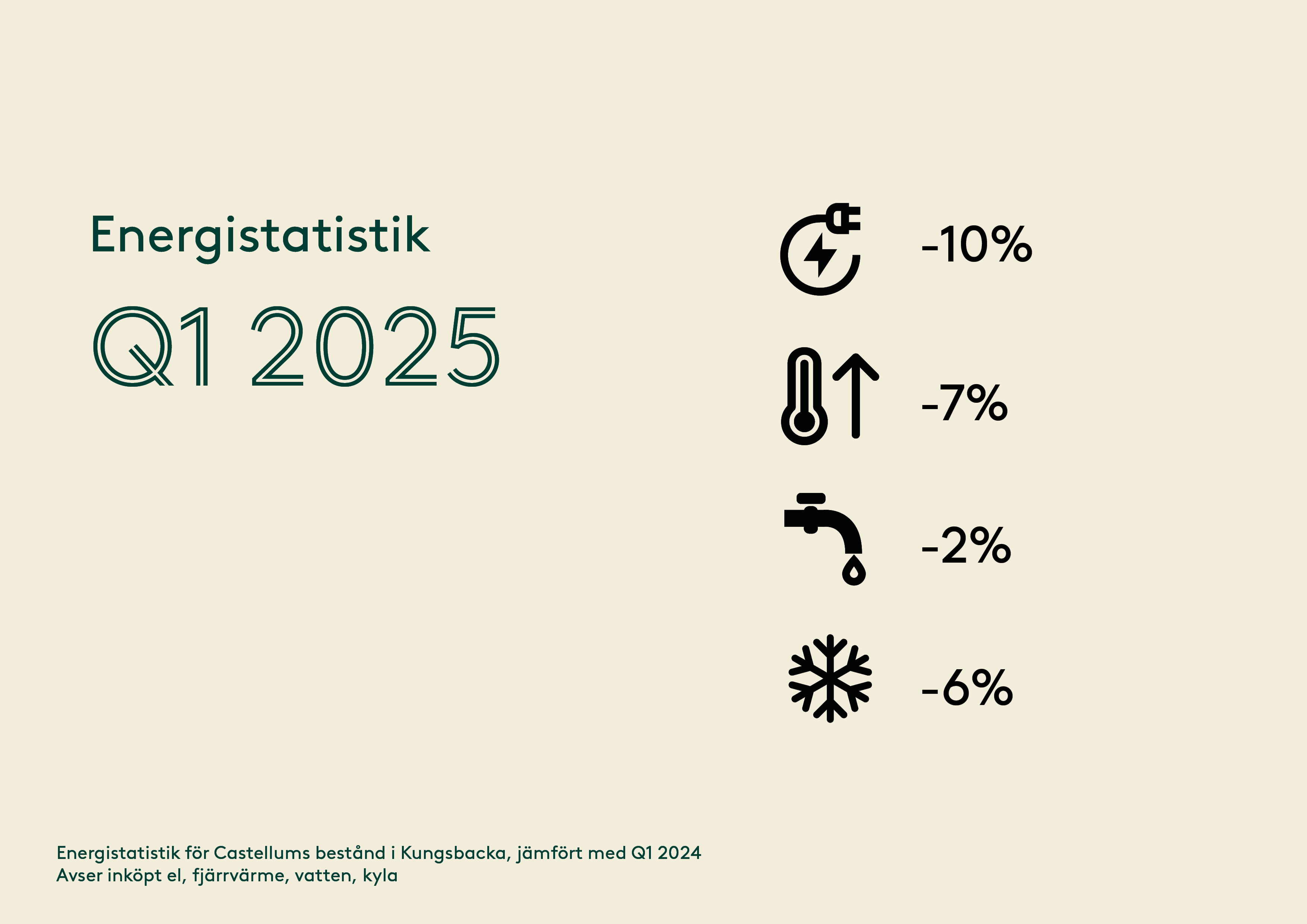 Castellum i Kungsbacka visar vägen mot en energieffektiv framtid. Under det första kvartalet 2025 minskade energianvändningen i vårt fastighetsbestånd med hela 8 % jämfört med samma period föregående år. Det är ett tydligt kvitto på att våra målmedvetna insatser för ett mer hållbart fastighetsägande ger resultat!