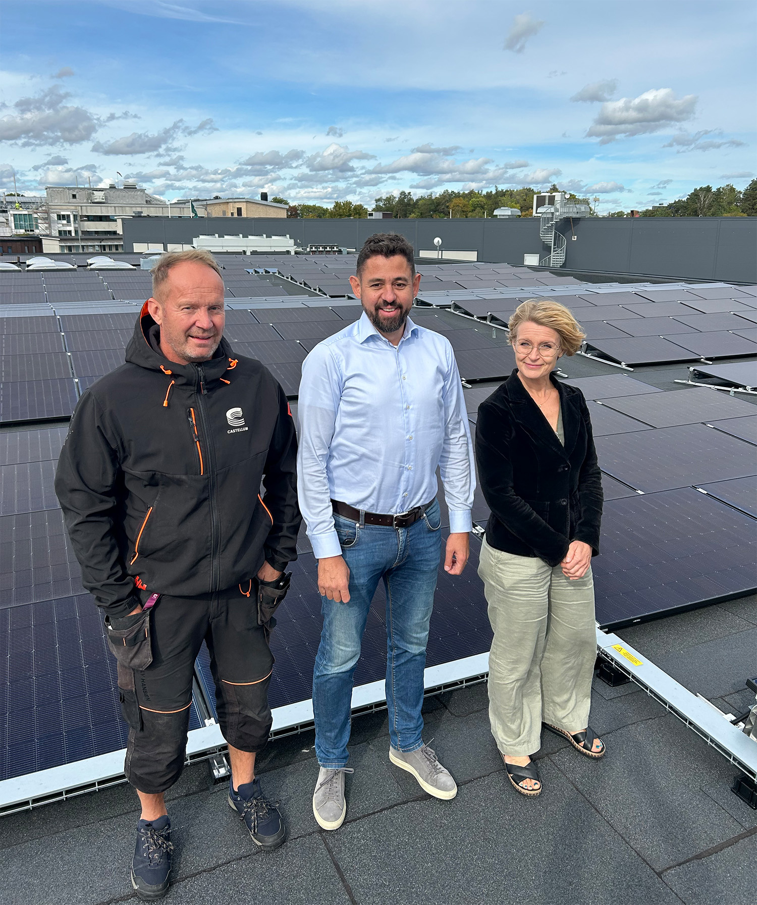 Anderson och Tillmans VD Dirk van der Krogt i mitten tillsammans med Maria Hydling, Kommersiell förvaltare och Tomas Tedenlind, Fastighetsansvarige, inspekterar den stora solcellsanläggningen.