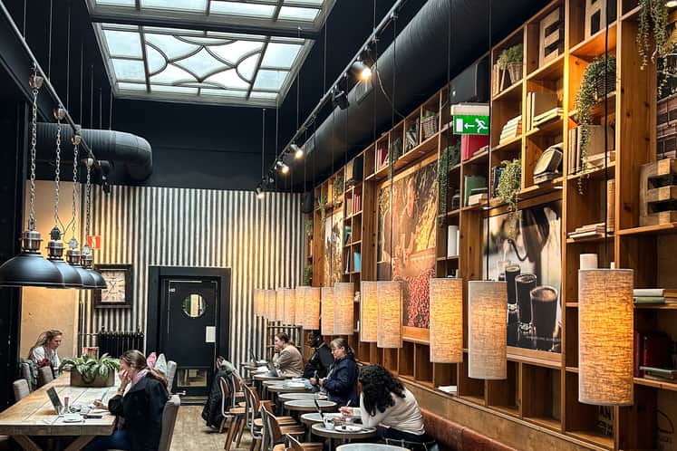 Lokalen präglas av både höjd och djup, med långa bänkar längs väggen under ett nästan katedralmässigt glastak. Här samlas både folk på språng till jobbet och stammisar som tillbringar betydligt längre tid. På morgonen är publiken lite äldre, och många gäster använder gärna det trivsamma kaféer som kontor eller studieplats.