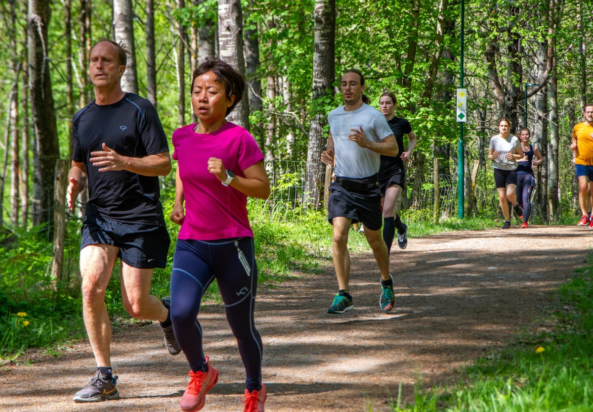 Hon berättar att det brukar vara väldigt god stämning på passen, menar att det är en härlig atmosfär att träna i. Elin springer själv i gruppen med mer vana löpare, så jag tänker att hon pratar om den, men så berättar hon vidare om kollegan som valde att byta till ”kom i gång-gruppen” och jag förstår att den goda stämningen och atmosfären verkar gälla generellt.