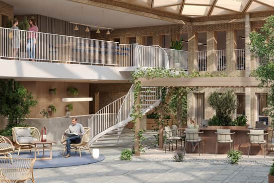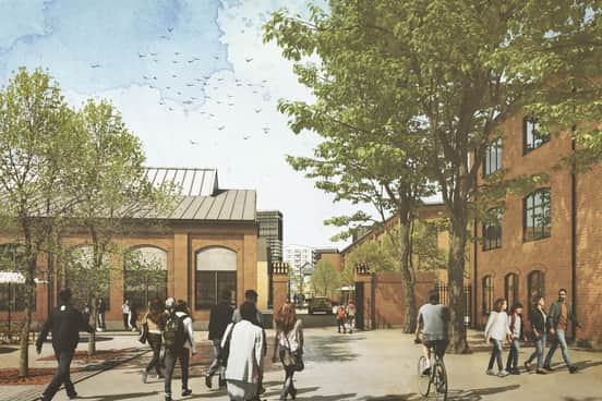 På innergårdarna till det vackra gamla gasverket på Norra Bangården väntar mysiga gårdsmiljöer, restauranger, butiker och 700 nya arbetsplatser på att ta form.