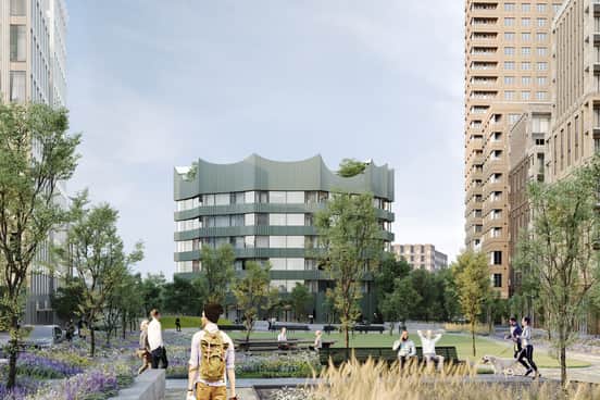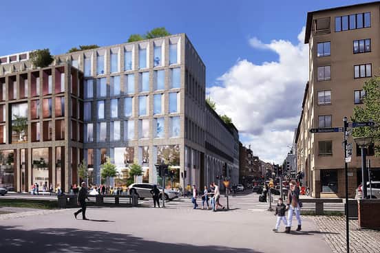 Wingårdh Arkitektkontor har gestaltat ett åttakantigt, smaragdgrönt kontorshus som blir ett framträdande entrémotiv för besökare till Stockholm norrifrån.