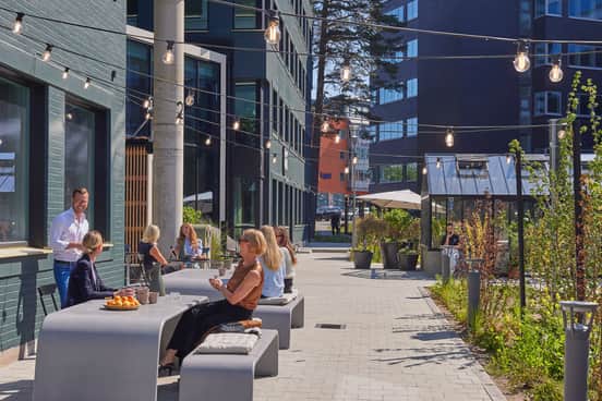Tre hus med ett gemensamt entréplan. En social och kreativ plats byggd för möten, entreprenörskap och ett arbetsliv med gott om rum för både nytta och nöje.