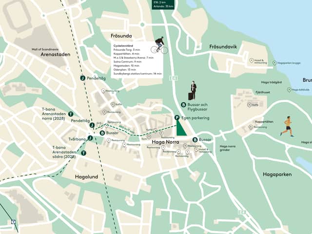 • <10 min till tåg, pendeltåg, buss, flygbuss, t-bana (Arenastaden, 2028)
