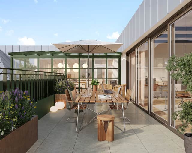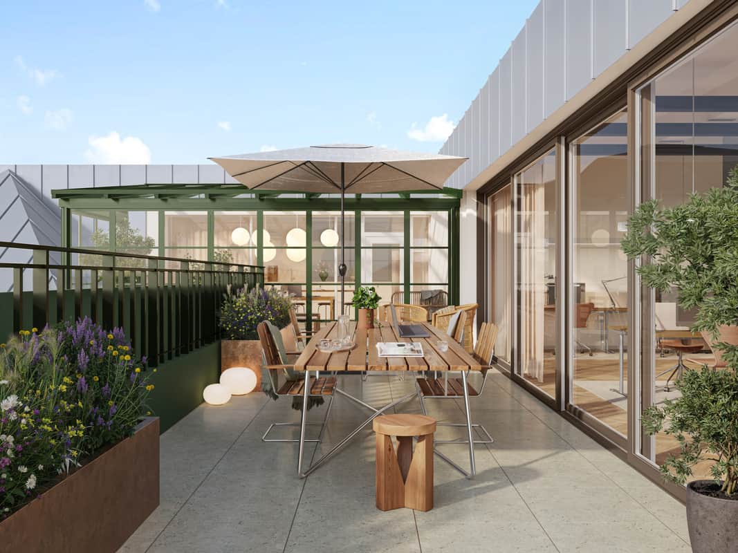 Högst upp i huset skapas dessutom en takterrass med ett inglasat orangeri – en grön och avkopplande miljö för möten, pauser eller inspiration under hela året.