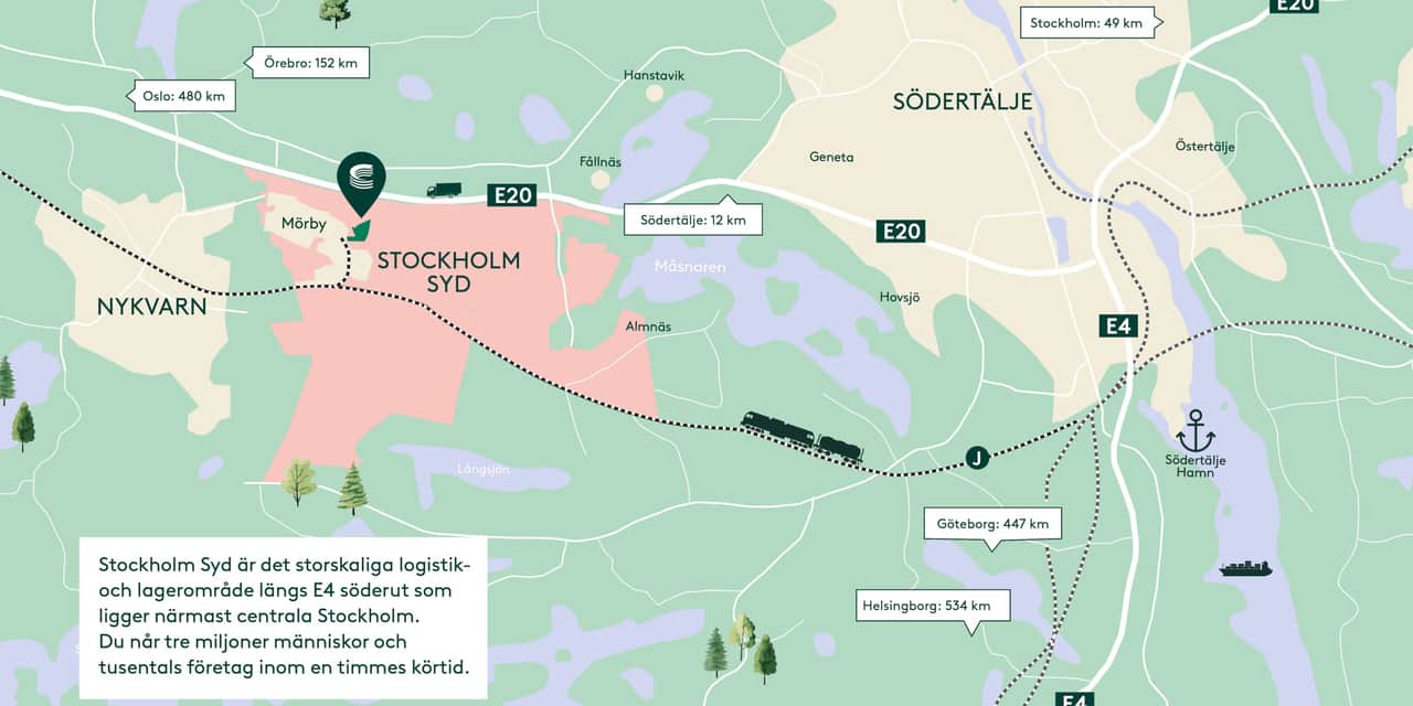 Stockholm Syd utvecklas till ett av Sveriges största områden för industri och logistik – mycket tack vare sitt strategiska läge. Här finns E20 i direkt anslutning och nära koppling till E4, bara 30 minuter från Stockholm city och med smidiga transporter mot Mälardalen, Göteborgs och Helsingborgs hamnar, samt västra Sverige och Oslo. När Förbifart Stockholm står klar 2030 blir kopplingarna till norra och västra Stockholm ännu bättre. Södertälje hamn med sin kombiterminal skapar en viktig länk mellan sjö, väg- och järnvägstransporter. Samtidigt går Svealandsbanan genom området, med industrispår som gör det möjligt att flytta gods från väg till järnväg – en viktig del i mer hållbara transportflöden. Sammantaget ger det ett läge som är svårt att slå: nära marknaden, nära infrastrukturen och med goda förutsättningar att växa. När Stockholm Syd är fullt utvecklat blir det en av regionens viktigaste noder för industri och logistik.