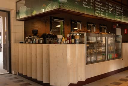 Bardisken inne på restaurangen och fiket Carotte x Werket har fått sin front från spill från KL-bjälklag som fanns i huset.