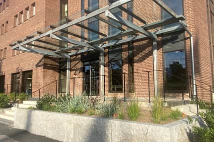 Den lastbrygga som fanns sedan tidigare och stommen till ett tidigare skärmtak till den har återbrukats och blivit tak till en ny entré på huset.