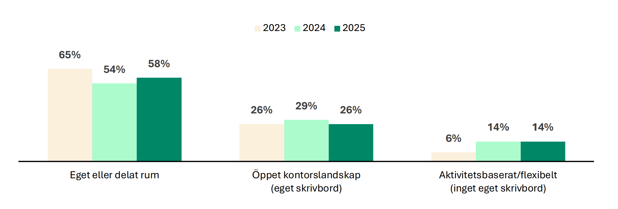 | Aktivitetsbaserat/flexibelt (inget eget skrivbord) | 22% | 33% |