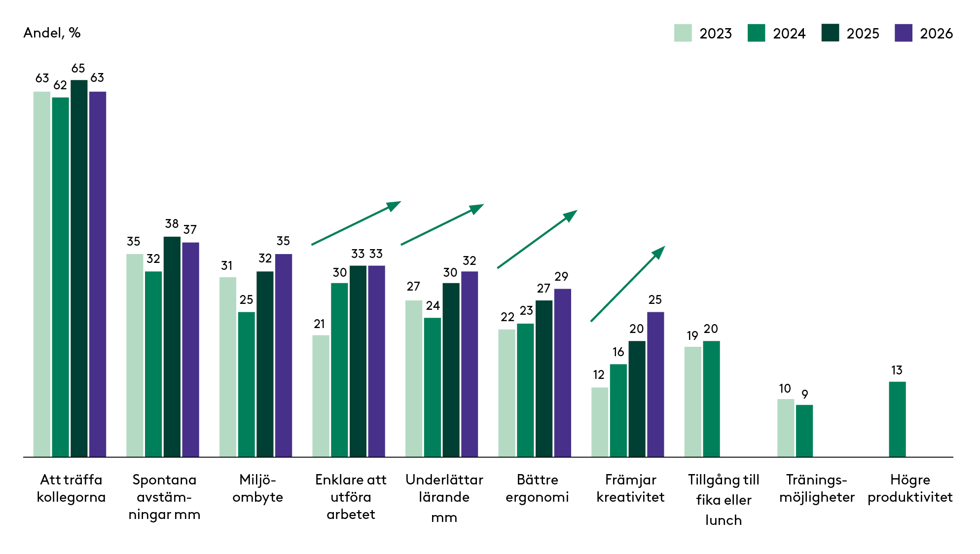 För fjärde året i rad är umgänget med kollegor den största fördelen med att arbeta på kontoret. Samtidigt syns en tydlig trend: kontorets betydelse för att utföra arbetet effektivt, underlätta lärande, förbättra ergonomi och främja kreativitet har ökat successivt de senaste åren.